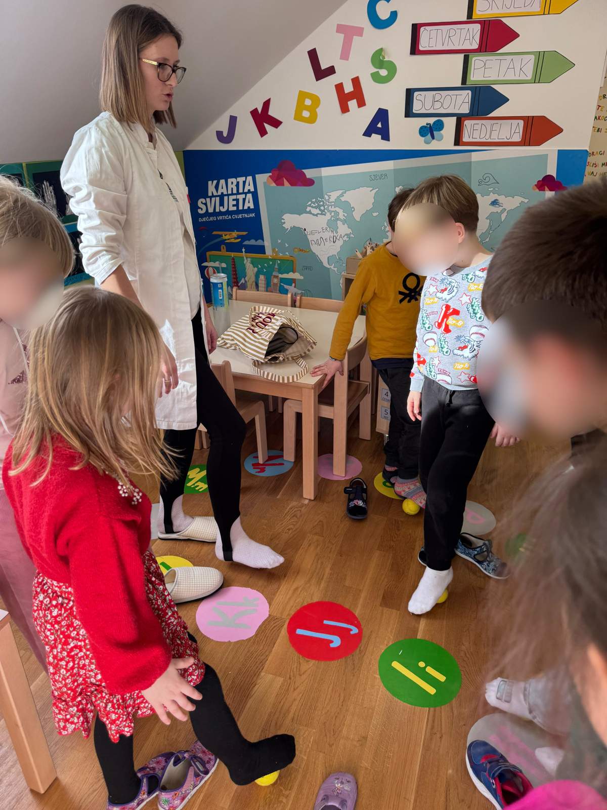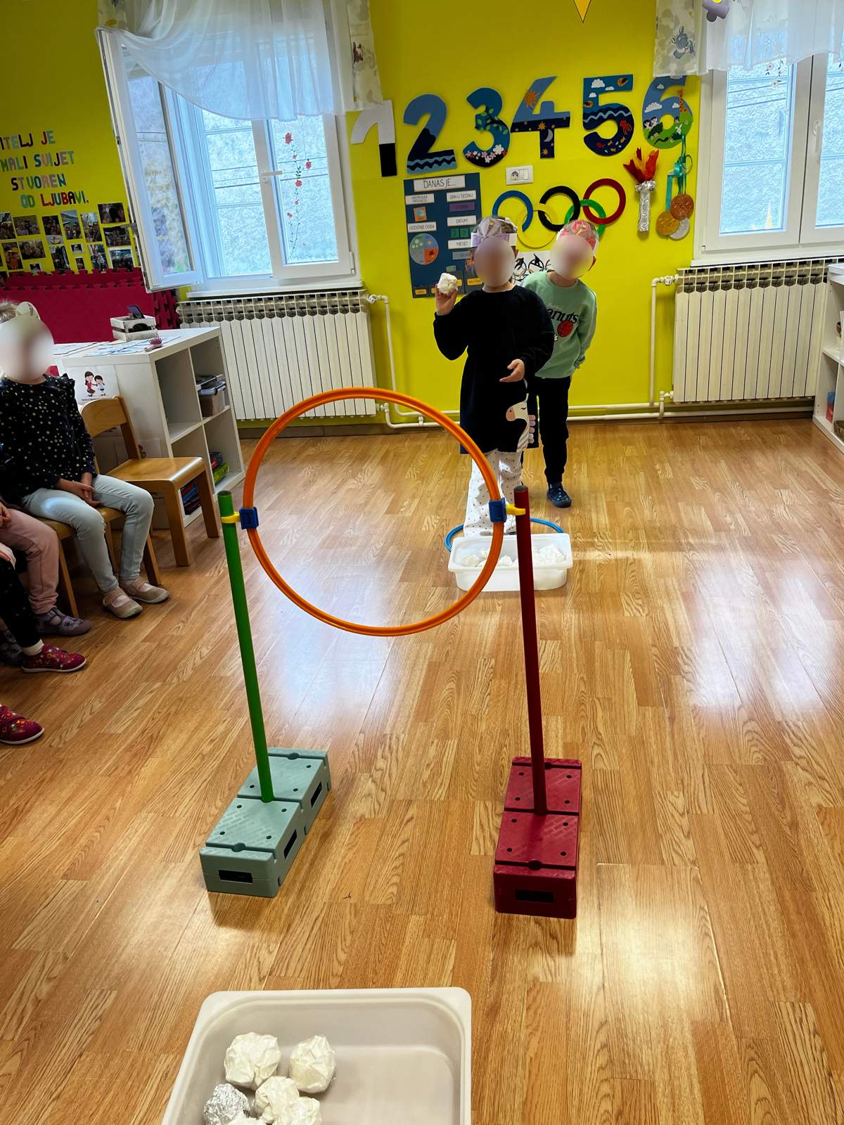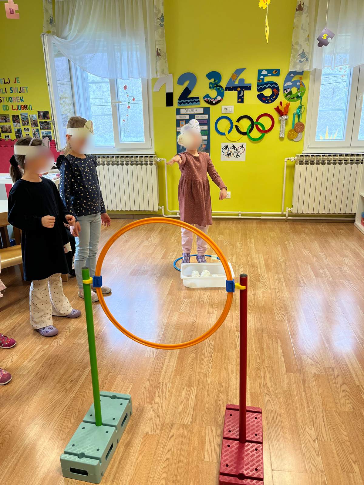- Razvoj kombinacije i preciznosti pokreta (aktivnost ubacivanja loptica u kutiju, bacanje obruča na štap, te aktivnost pravilnog skakanje po predlošku)