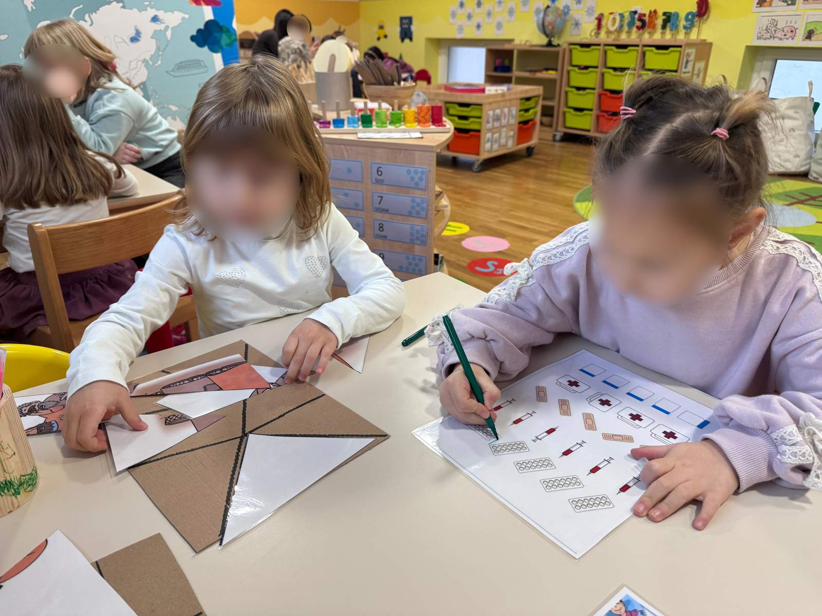 - Razvoj pamćenja, koncentracije i logičkog zaključivanja putem stolno-manipulativnih aktivnosti (motorički memory, šivalice, matematička slagalica)